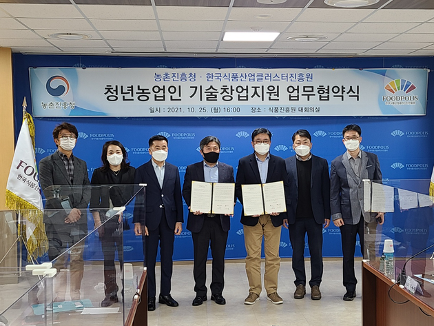 한국식품산업클러스터진흥원(이사장 김영재, 이하 ‘식품진흥원’)은 25일 농촌진흥청(청장 허태웅, 이하 ‘농진청’)과 청년농업인의 기술창업 지원 및 벤처기업 육성을 위한 업무협약을 체결했다고 밝혔다.