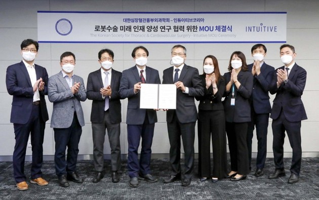 인튜이티브코리아 (한국지사 대표 최용범, 이하 인튜이티브)가 지난 29일 대한심장혈관흉부외과학회(이사장 김웅한)와 흉부외과 수술 영역에서의 로봇수술 미래 인재 양성 및 연구 협력 위한 상호협력을 약속하는 양해각서(MOU)를 체결했다고 밝혔다.