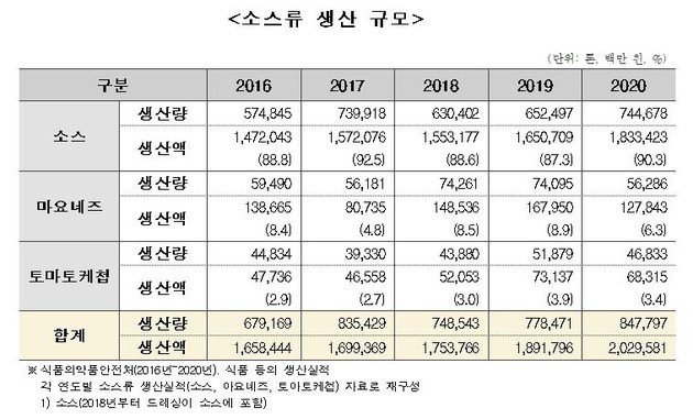 농림축산식품부(장관 김현수, 이하 농식품부)와 한국농수산식품유통공사(사장 김춘진)는 소스류에 대한 2021 가공식품 세분시장 현황 보고서에 따르면, 소스류 생산액은 2020년 기준 2조 296억원으로 2016년 1조6584억원 대비 22.4% 증가했다.