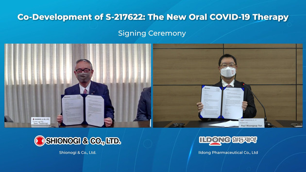 일동제약과 시오노기는 최근 온라인을 통해 양사 공동개발에 대한 계약서에 서명했다. 이 행사에서 일동제약 윤웅섭 대표와 시오노기의 테시로기 이사오 대표는 “S-217622의 공동개발은 단순히 사익(社益)이나 비즈니스를 넘어, 코로나 사태 해소를 위한 제약회사의 사회적 의무”라며 “사람들의 치료제 개발 염원을 책임감으로 삼아 성공적 개발을 위해 적극 협력할 것”이라고 공감했다.