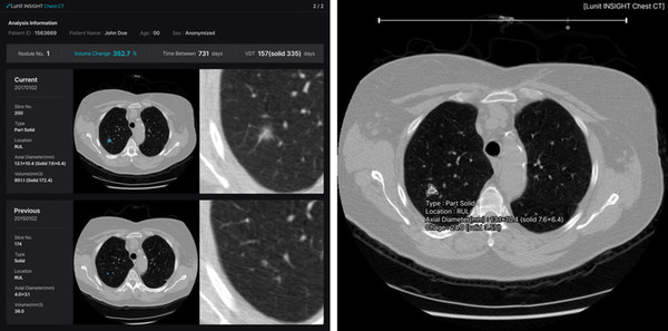 이번에 처음 공개하는 루닛 인사이트 체스트 CT와 루닛 인사이트 DBT는 각각 흉부 CT 및 DBT의 3차원(3D) 영상을 AI를 통해 보다 빠르고 정확하게 판독함으로써 의료진의 진단을 보조하는 제품이다. 흉부 엑스레이와 유방조영술이 폐암과 유방암을 유발할 수 있는 질병을 1차적으로 발견하는 검사라면, CT와 DBT는 검출된 결절을 더 자세히 관찰해 암을 구별할 수 있는 보다 정교한 검사로 의료기관에서 활용도가 높다.