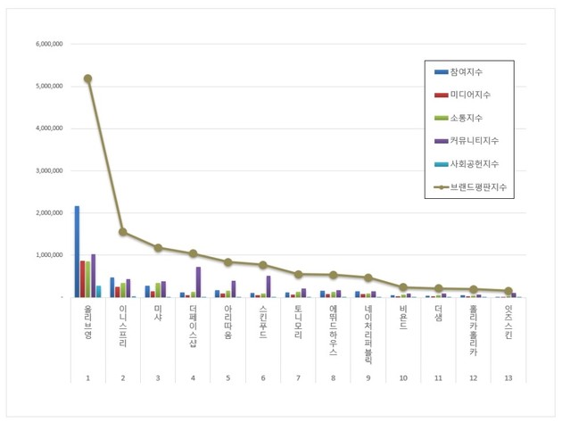 12월 화장품 전문점 브랜드평판 순위는 올리브영, 이니스프리, 미샤에 이어 더페이스샵, 아리따움, 스킨푸드, 토니모리, 에뛰드하우스, 네이처리퍼블릭, 비욘드, 더샘, 홀리카홀리카, 잇츠스킨 순으로 분석됐다.