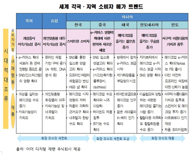 또한 북미와 유럽 등 선진국에서는 개인맞춤형 제품이나 지속가능성의 메가 트렌드가 나타남에 비해, 한국‧중국은 SNS와 디지털 커머스 등 디지털 기반의 소비패턴이 특징적이며, 태국, 인도네시아, 인도 등 동남아 국가는 메이크업 시장이 확대되고 있는 등 차이가 있다는 점을 확인하고, 선진시장과 아시아 시장에 서로 다른 대응을 해야 함을 제안했다.
