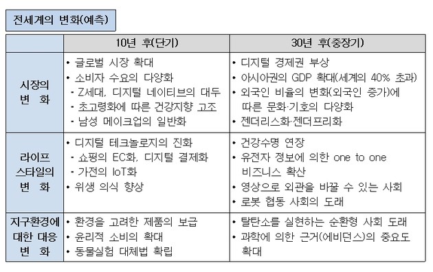 이와 함께 화장품 산업에서 주목해야 할 환경변화로 신흥 외국기업의 대두, AI, 빅데이터, 양자컴퓨팅 등 디지털 기술, 유전자연구 수준의 생명공학 기술 등 타 분야의 기술과 지식을 활용해 기술력 향상과 새로운 가치 창조로 연결해 나가는 혁신의 중요성, 타 업종에서 화장품 시장 진출 활성화, SDGs(Sustainable Development Goals) 등 전 세계적인 지속가능성 중시, 화장의 사회적 가치 중시 등을 제시했다.