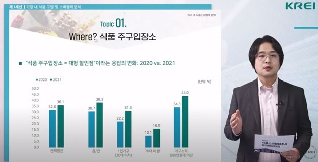 이 같은 결과는 한국농촌경제연구원(KREI, 원장 김홍상)이 14일 온라인 유튜브 채널을 통해 개최한 ‘2021 식품소비행태조사 결과발표대회’에서 나왔다. 이날 이계임 박사 연구팀은 2021년도 우리나라 가구의 식품소비와 외식행태, 식생활에 대한 조사결과를 발표했다.