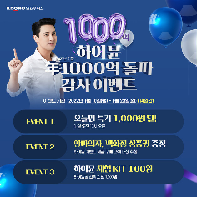 일동후디스가 단백질 보충제 ‘하이뮨 프로틴 밸런스(이하 하이뮨)’ 연 매출 1000억 돌파를 기념해 오는 23일(일)까지 감사 이벤트를 진행한다고 밝혔다.