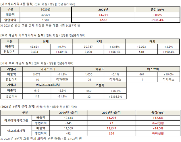 국내의 경우 온라인과 면세 채널이 전체 매출 성장세를 주도했다. 해외 시장에서는 럭셔리 브랜드 믹스 개선과 매장 효율화로 인해 영업이익이 개선됐다. 주요 자회사들은 디지털 마케팅을 강화하며 온라인 채널에서의 매출 성장세를 이어나갔다. 2021년 그룹 전체의 화장품 부문 매출은 4조9237억원으로 집계됐다.