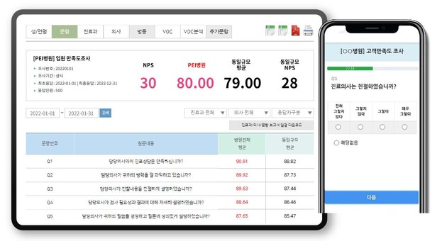 한 대학병원 관계자는 "모든 값이 자동으로 계산되기 때문에 기존 통계 정리, 보고서 작업 등에 소요되었던 업무 부담이 없어진 것이 PEI 솔루션의 가장 편리한 점이다"며 "PEI솔루션을 통해 우리 병원의 환자경험평가 점수 추이를 실시간으로 조회할 수 있고, 다른 병원과의 실시간 점수 비교를 통해 우리 병원의 상대적 취약점들을 파악하여 개선할 수 있는 것이 장점이다"고 말했다.
