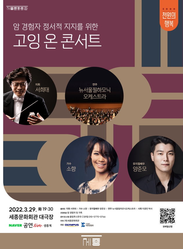 이번 공연은 암 경험자 및 가족을 공연장으로 직접 초청하는 한편 일부 객석은 일반에게도 오픈된다. 암 경험자 및 가족은 오는 3월 23일까지올림푸스한국 홈페이지를 통해 초대권을 신청할 수 있다.