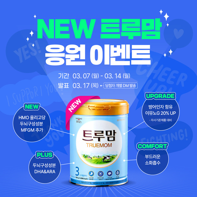 일동후디스는 트루맘 리뉴얼을 기념해 오는 14일(월)까지 이벤트를 진행한다. 이벤트는 트루맘 공식 인스타그램 내 해당 게시물에 응원 메시지를 남기면 참여 완료된다. 선정된 총 30명에게는 새로워진 트루맘 제품을 증정하며, 당첨자는 3월 17일(목)에 개별 발표할 예정이다.