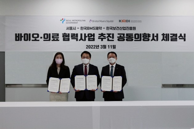한국BMS제약(대표이사 김진영)은 지난 11일 서울특별시, 한국보건산업진흥원과 국내 바이오·의료 분야 혁신을 위한 협력 체계를 구축하는 공동의향서(LOI)를 체결했다고 밝혔다. LOI 체결식에는 김진영 한국BMS제약 대표이사와 서울특별시 황보연 경제정책실장, 한국보건산업진흥원 김영옥 기획 이사 등이 참석해 서명했다.