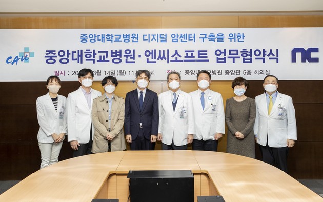 이날 자리에는 중앙대의료원 홍창권 의료원장, 중앙대병원 이한준 병원장, 엔씨소프트 안용균 전무 등이 참석해 디지털 암 관리(D-CAM)센터 구축을 위한 상호 협력을 약속하고, 엔씨소프트는 중앙대병원에 센터 구축 후원금을 전달했다.