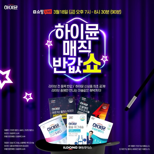 일동후디스가 오늘(18일) 오후 7시부터 네이버 쇼핑라이브에서 '하이뮨 매직 반값쇼'를 진행한다고 밝혔다.