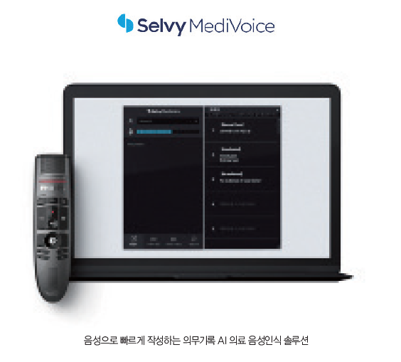먼저 '셀비 메디보이스(Selvy MediVoice)'는 인공지능 음성인식 기반의 국내 최초 AI 의료 음성인식 솔루션이다. 영상의학과, 핵의학과, 수술실, 소화기내과 등 분과별 의학용어를 학습해 98% 이상의 높은 인식 성능을 자랑한다.