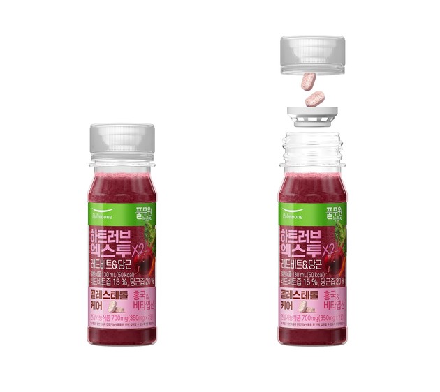 음료 뚜껑에는 혈중 콜레스테롤 개선에 도움을 줄 수 있는 기능성이 확인된 고시형 원료인 홍국과 비타민 B6, B12, 엽산을 건강기능식품 정제로 담았다.