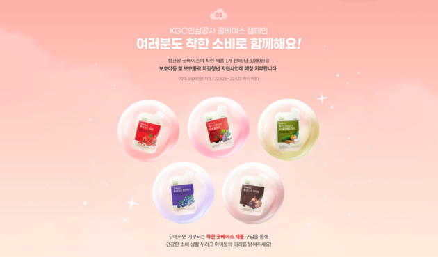 '정관장 굿베이스와 함께하는 꿈베이스' 캠페인은 3월 23일부터 4월 22일까지 한달간 정관장 온라인 공식몰인 '정몰'에서 굿베이스 제품 구입 시, 제품 1개당 KGC인삼공사에서 자립 준비 청년을 위해 3000원씩 기부하는 방식이다. 참여고객에게는 5월 한달간 굿베이스 제품(에센셜 케어 제외) 10% 할인 받을 수 있는 '시크릿 쿠폰'을 제공한다.