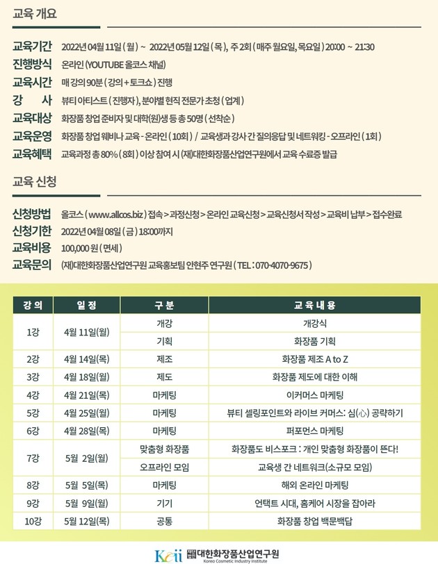 주요 교육내용으로는 △화장품 제도 분석 △상품 기획 △제조 공정 △온라인 마케팅 △홈케어 기기 개발 △해외 수출 △라이브 커머스 운영 노하우 등 모두 10개 부문이며 각 분야별 현업 대표들이 강사로 나선다.