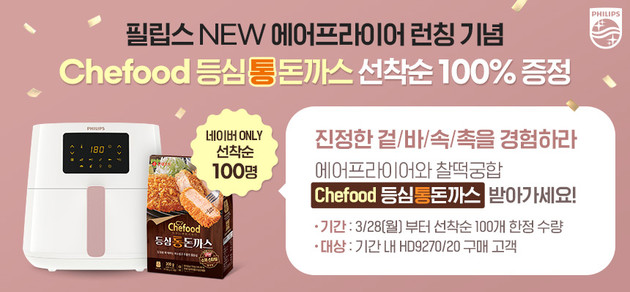 28일부터 필립스 생활가전 코리아 네이버 스마트스토어에서 해당 신제품 에어프라이어(모델명: HD9270/20)를 구매한 고객 선착순 100명에게 Chefood 등심통돈까스 300g X 2를 제공한다. 또 추가로 5월 28일까지 필립스 에어프라이어 구매 고객 모두에게 롯데푸드몰 Chefood 만두&후라이 30% 할인 쿠폰도 증정한다. 상세 내용은 필립스 생활가전 코리아 네이버 스마트스토어에서 확인할 수 있다.