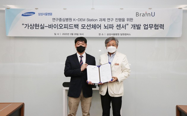 삼성서울병원 디지털치료연구센터와 브레인유는 연구중심병원육성 R&D 사업 'K-DEM(Digital&Electronic medicine) Station 구축' 과제 연구 진행과 가상현실-바이오피드백 뇌파 센서 개발을 위한 업무협약(MOU)을 체결했다.