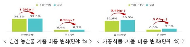 코로나19 발생 전인 2018∼2019년과 발생 후인 2020년을 구분해 신선 농산물, 가공식품 구매액(지출) 변화를 비교한 것이다.