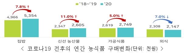 코로나19 발생 전보다 신선 농산물 지출은 11.0% 늘고, 가공식품 지출은 5.0% 늘었다.