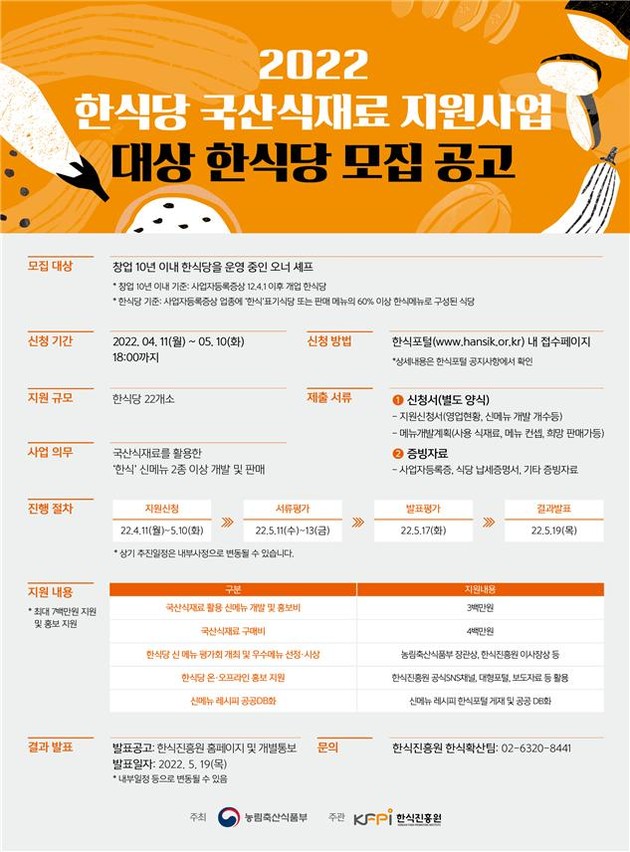 농림축산식품부(장관 김현수, 이하 농식품부)와 한식진흥원(이사장 임경숙)은 '2022 한식당 국산 식재료 지원사업'대상 한식당을 4월 11일부터 5월 10일까지 모집한다고 밝혔다.