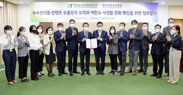 한국농수산식품유통공사(사장 김춘진)와 한국콘텐츠진흥원(원장 조현래)는 13일 한국농수산식품유통공사에서 농수산식품 및 콘텐츠 수출 활성화와 저탄소 식생활 글로벌 확산을 위한 업무협약을 체결했다.