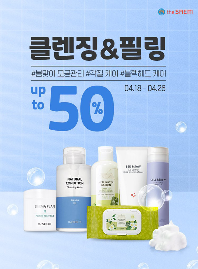 더샘은 산뜻하고 순한 사용감으로 국민 클렌저로 입소문 난 '힐링 티 가든', 민감 피부 진정템으로 유명한 '더마 플랜', 묵은 각질과 모공 노폐물을 깨끗하게 케어해주는 마일드 필링 젤 '셀 리뉴 바이오 마이크로 필 소프트 젤' 등 대표 클렌저와 필링 케어 제품을 최대 50% 할인한다.