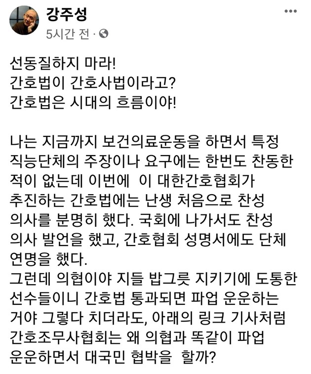 수십 년간 시민의 편에서 보건의료운동을 펼쳐온 강주성 간병시민연대 활동가(전 건강세상네트워크 대표)가 28일 본인 계정의 페이스북 글을 통해 이같이 밝힌 뒤 "국회에 나가서도 찬성 의사 발언을 했고, 대한간호협회 성명서에도 단체 연명을 했다"며 간호법 찬성 의견을 강력히 밝혔다.