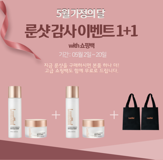 뷰티 브랜드 룬샷이 5월 가정의 달을 맞아 고객 감사 이벤트를 진행한다. 2일부터 20일간 진행되는 이번 이벤트에서는 세트 구매 상품에 한해 1+1 증정과 쇼핑백 2개가 함께 발송된다.