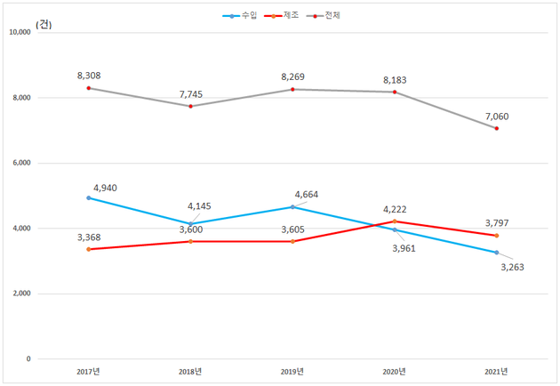 이를 살펴보면 2021년 전체 의료기기 품목허가(인증·신고 포함) 수는 총 7060건으로, 2020년 대비 1123건(13.7%) 감소한 가운데, 2020년에 이어 2년 연속 국내 제조 의료기기 품목허가 비율이 수입을 추월했다.