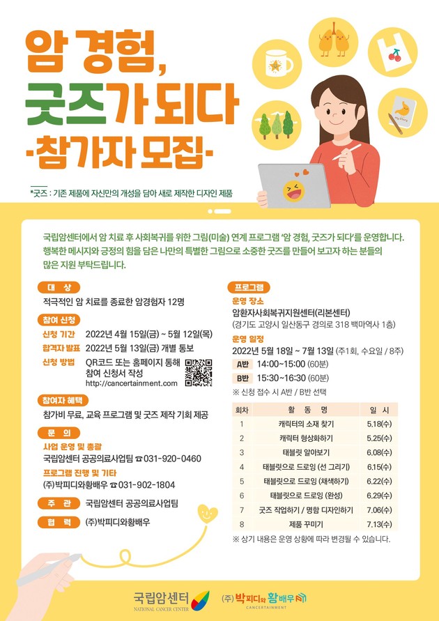 '암 경험, 굿즈가 되다'는 암 환자의 자기효능감 증진 및 사회경제적 활동을 지원하기 위한 프로그램이다. 이번 프로그램은 암 경험자의 사회 복귀와 사회적 인식개선을 위해 다양한 제품과 콘텐츠를 개발하는 예비사회적기업 박피디와황배우와 협력해 운영한다.