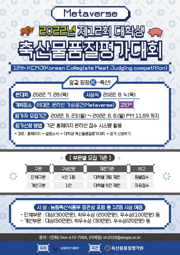 축산물품질평가원(원장 장승진, 이하 축평원)은 축산·식육 분야 청년의 진로 탐색의 장이 될 '제12회 대학생 축산물품질평가대회'를 개최한다.