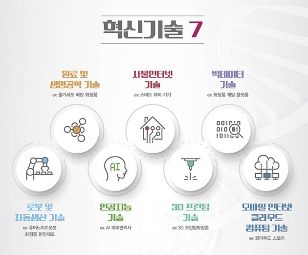 진흥원은 '2021 혁신기술 중심의 미래화장품 개발 개술융합 조사·분석 연구'에서 미래 화장품 혁신기술로 △원료·생명공학 기술 △사물인터넷 기술 △빅데이터 기술 △로봇·자동생산 기술 △인공지능 기술 △3D 프린팅 기술 △모바일 인터넷 클라우드 컴퓨팅 기술 등 7개를 꼽았다.