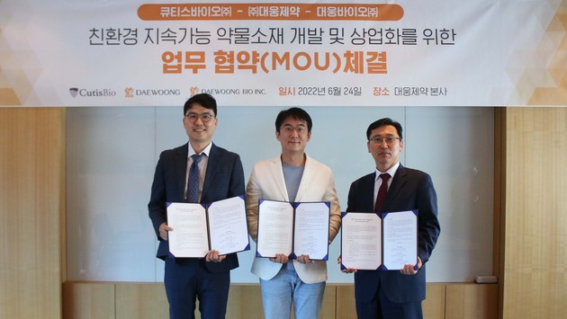 대웅제약(대표 전승호∙이창재)은 지난 24일 삼성동 본사에서 협약식을 갖고 대웅바이오-큐티스바이오와 함께 '합성생물학 기술과 바이오 파운드리를 활용한 친환경 지속가능 약물소재의 개발 및 상업화'에 대한 양해각서를 체결했다고 27일 밝혔다.
