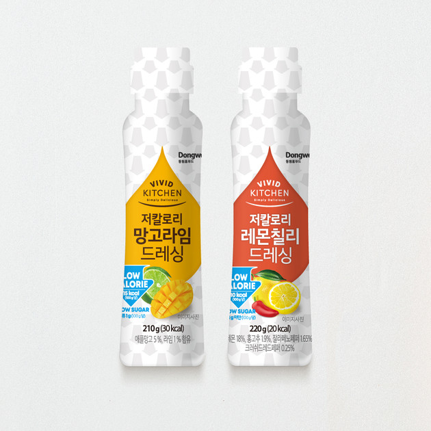 '비비드키친 저칼로리 드레싱' 2종은 100g당 열량이 각각 10kcal(레몬칠리), 15kcal(망고라임)이고, 당 성분이 1g 이하인 저칼로리, 저당 제품이다. 동원홈푸드는 최근 샐러드가 건강한 한 끼 식사로 떠오르면서 수요가 크게 늘고 있는 점에 착안해 샐러드와 곁들여 먹는 저칼로리 드레싱을 개발했다.