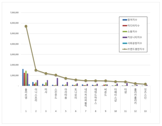 7월 화장품 전문점 브랜드평판 순위는 올리브영, 이니스프리, 미샤에 이어 스킨푸드, 아리따움, 토니모리, 네이처리퍼블릭, 에뛰드하우스, 비욘드, 더페이스샵, 더샘, 홀리카홀리카, 잇츠스킨 순으로 분석됐다.