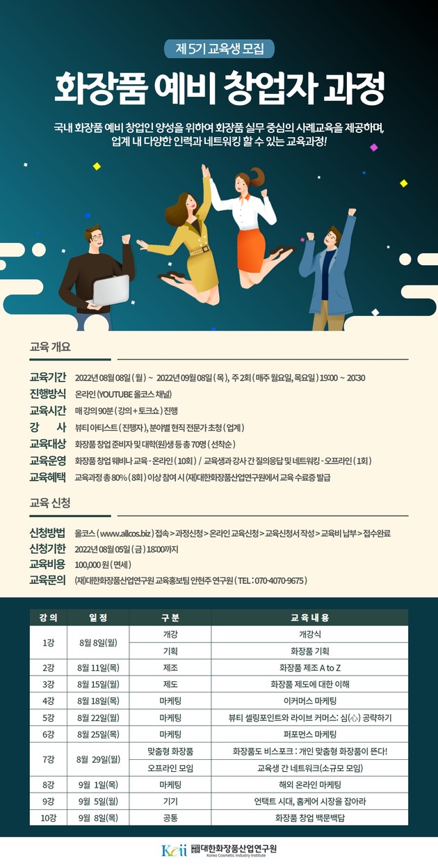 5기 과정의 모든 교육은 코로나19 상황을 고려, 유튜브를 통한 비대면 방식으로 진행된다. 주요 교육내용으로는 △상품 기획 △제조 공정 △화장품 제도 분석 △온라인 마케팅 △해외 수출 △라이브 커머스 △맞춤형 화장품 등 모두 10개의 주제로 구성됐으며, 각 분야별 현업 대표 창업자들이 직접 강사로 나서 실전 노하우를 전달할 예정이다.