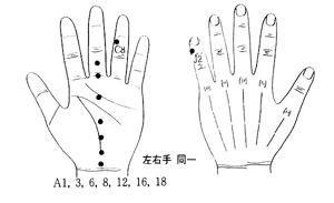 위절제 수술을 받은 회갑을 넘긴노인이 위 수술을 받은 후로 소화도 잘 안되며 원기부족으로 정력이 감퇴돼 삶의 의욕을 잃었다. 기본방을 중심으로 수지침을 놓고 그 혈자리에 서금요법(서암뜸)을 뜨도록 손바닥에 A1ㆍ3ㆍ6ㆍ8ㆍ12ㆍ16ㆍ18, J2, C8을 점으로 표시해 줬다. 일주일 후에 소화도 잘되며 원기가 좋아졌고 삶에 대한 의욕이 생긴다고 좋아했다. |