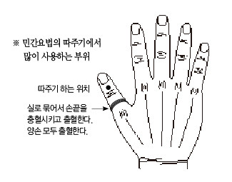 전래적인 민간요법에 있어서의 '따주기'는 매우 단순한 방법이었다. 급성 경기나 체했을 때 실로 엄지손가락 끝마디를 꼭 묶으면 손끝까지 충혈이 되는데 이때 바늘로 I38 지점(엄지손가락 끝마디와 엄지손가락 손톱 뿌리의 중간지점)을 살짝 찌르면 검붉은 피가 흘러나온다. 그리고 잠시 있으면 급체나 급성 경기는 곧 진정되면서 곤히 잠을 자거나, 토하고 설사를 한 후 진정이 된다.