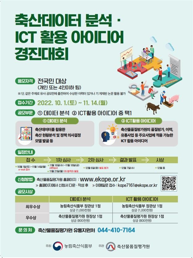축산물품질평가원(이하 축평원)은 농림축산식품부가 주최하고 축평원이 주관하는 '2022년 축산데이터 분석·ICT활용 아이디어 경진대회'를 개최한다.
