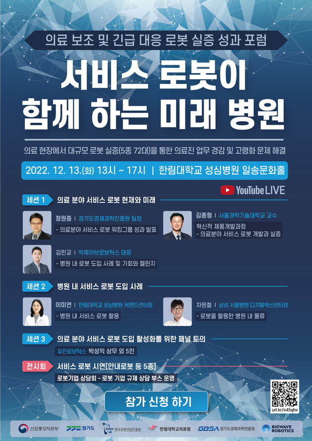 포럼은 3개의 섹션 총 6개의 발표로 구성됐다. 첫 세션에서는 '의료 분야 서비스 로봇 현재와 미래'를 주제로 △의료 서비스 로봇 워킹그룹 성과 발표(정원중 경기도경제과학진흥원 팀장) △의료분야 서비스 로봇과 실증(김종형 서울과학기술대 교수) △병원 내 로봇 도입 사례 및 기회와 챌린지(빅웨이브로보틱스 김민교 대표)에 대해 들을 수 있다.