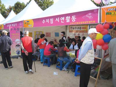 부평지회(지회장 장은숙 032-501-8858) 소속 10명의 수지침사들이 지난달 13일 오후 1시부터 5시까지 부평구청 인근 신트리 공원에서 부평구 자원봉사센터 주관으로 열린 ‘2007 부평구 자원봉사 박람회’에 참가해 300여명의 주민들에게 서금요법 봉사를 실시해 큰 호응을 얻었다.