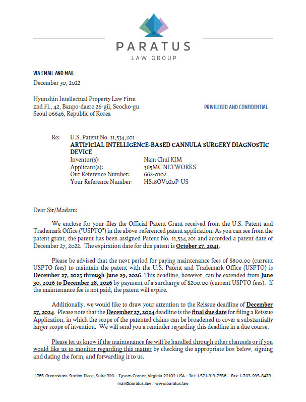 365mc는 인공지능 지방흡입 시스템(M.A.I.L System, Motion capture and Artificial Intelligence assisted Liposuction)에 대한 미국 특허를 취득했다고 밝혔다.