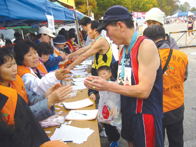 국내외에서 2만200여명의 마라토너들이 참가한 ‘제61회 춘천마라톤대회’가 지난달 28일 춘천에서 개최됐다. 가을 단풍이 곱게 물든 의암호를 끼고 달리는 42.195km의 코스에서 서금요법 봉사단원들의 활약상이 더욱 빛났다. 단비봉사단(단장 강미순 학술위원ㆍ수지침사), 춘천지회(지회장 정인화 033-243-8844), 방배지회(지회장 임흔옥 02-597-4963) 소속 130여명의 서금요법 봉사단원들이 출발점을 중심으로 일정한 구간에 배치돼 선수들의 완주를 위해 시술봉사를 해줬다. |