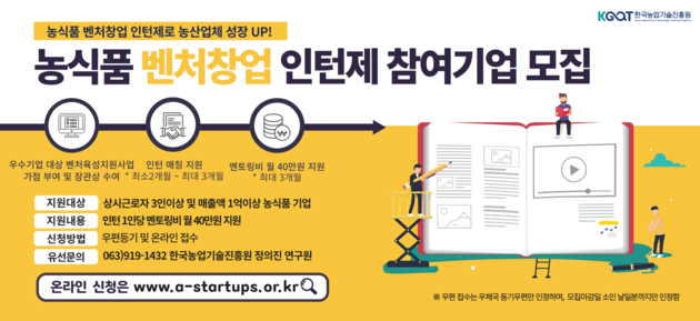 한국농업기술진흥원(원장 안호근, 이하 '농진원')은 농식품 분야 청년 창업자의 성공적인 창업활동 지원과 창업 저변확대를 위해 '농식품 벤처창업 인턴제' 사업 참가자를 오는 3월 27일(월)까지 모집한다고 밝혔다.