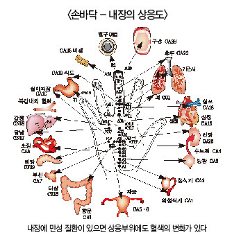 또한 어제부(魚際部)에서 적색이 나타나는 경우도 있는데, 이것은 열성질환(熱性疾患)이나 심장질환(心臟疾患)이 있음을 나타내준다.