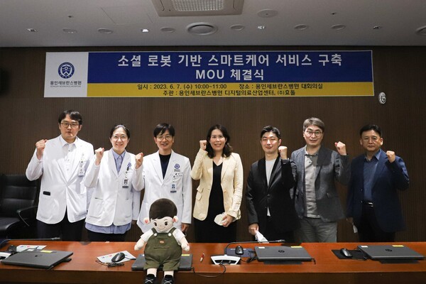 연세대학교 의과대학 용인세브란스병원(병원장 김은경)은 7일 인공지능(AI) 반려로봇 개발기업 효돌과 '소셜로봇 기반 스마트케어 서비스 구축 MOU'를 체결했다.