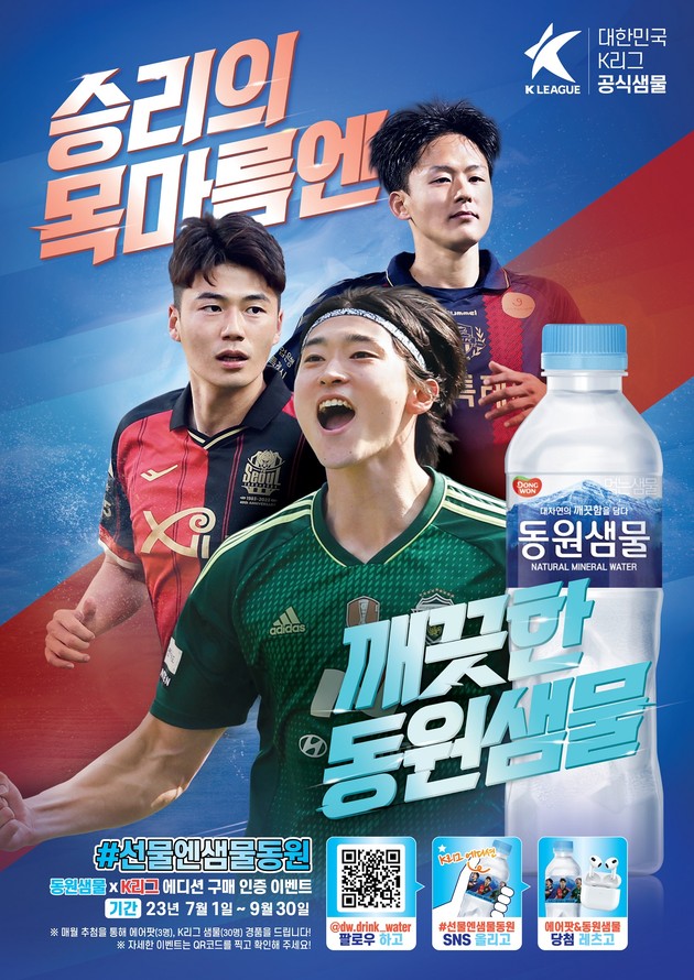 이번에 출시된 동원샘물 'K리그 에디션'은 현재 K리그에서 활약하고 있는 기성용, 조규성, 이승우 선수 등 3인을 제품 라벨에 담았다. 월드컵과 올림픽, 아시안컵 등에서 국가대표로 활약한 리그 대표 선수들을 동원샘물 제품에서 만나볼 수 있는 것이다.