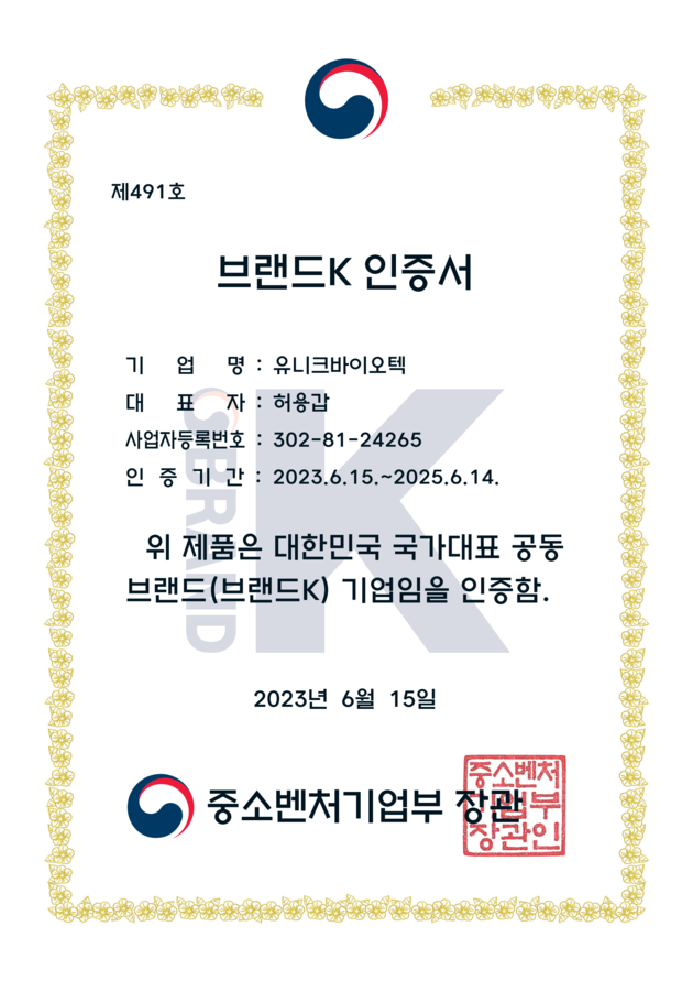 허용갑 유니크바이오텍 대표이사는 "유니크바이오텍의 탄탄한 기술력과 역량, 해외 수출을 위한 노력들이 빛을 발해 이번 브랜드K로 선정된 것 같아 기쁘다"라며 "이번 기회를 발판 삼아 세계 시장 진출과 영향력 확장을 위해 힘쓰겠다"라고 밝혔다.